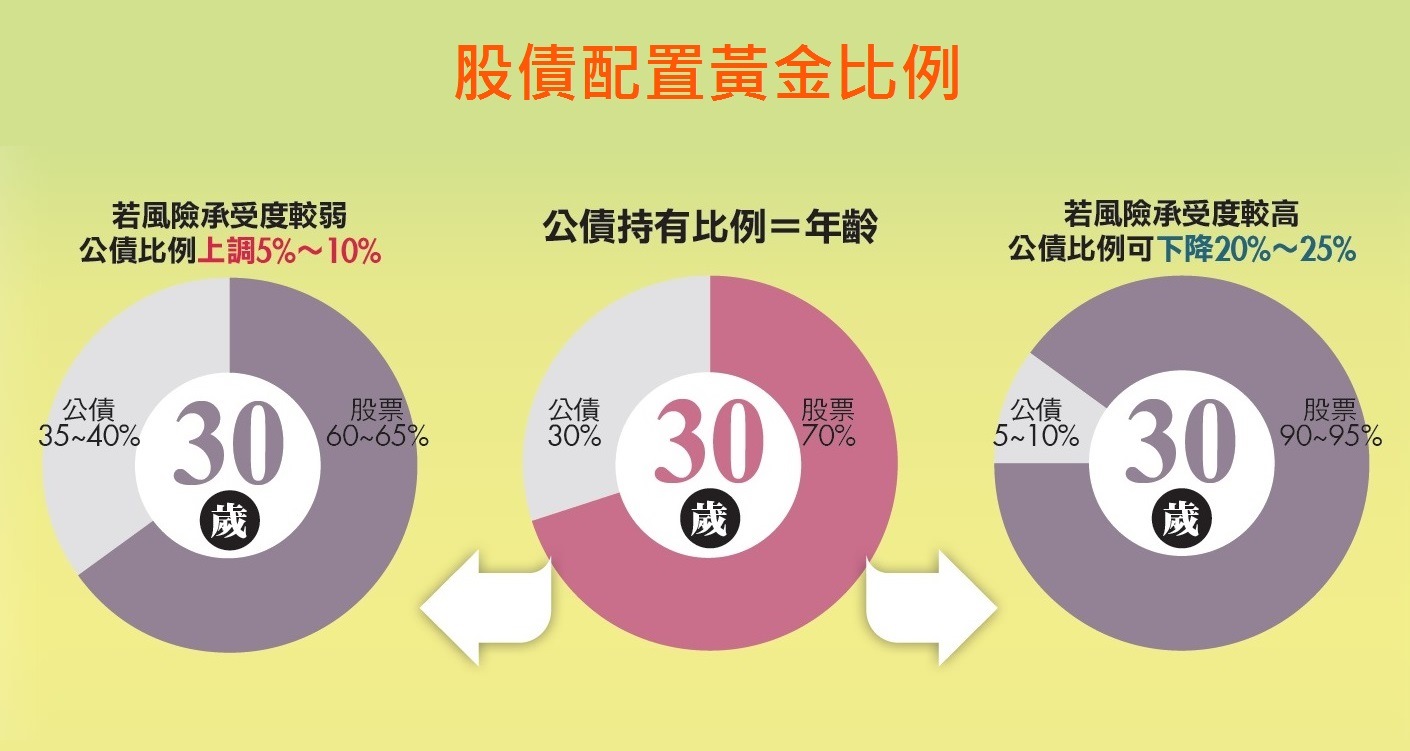 投資組合中公債的持有比例約等於投資人的年紀,每個人可再依自己的風險承受能力,在公債的部分上下微調10%。例如現在30歲,資產配置的黃金比例是:公債30%、股票70%,但如果覺得自己風險承受度較弱,公債比例可增加5~10%,變成35~40%,相對來說,若覺得風險承受度較高,則公債比例可下降為20~25%。